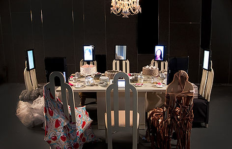 Presented in a domestic setting, a dining table is set with decadent cakes, dishes, teacups, and six dressed chairs with video monitors as talking heads. Each chair represents a woman and her choices, justifications, and dilemmas concerning family and professional life. One chair is left empty for the viewer to sit and participate in this interactive aural collage. An iPad replaces a plate setting so that the guest can leave their own opinion in a virtual community.